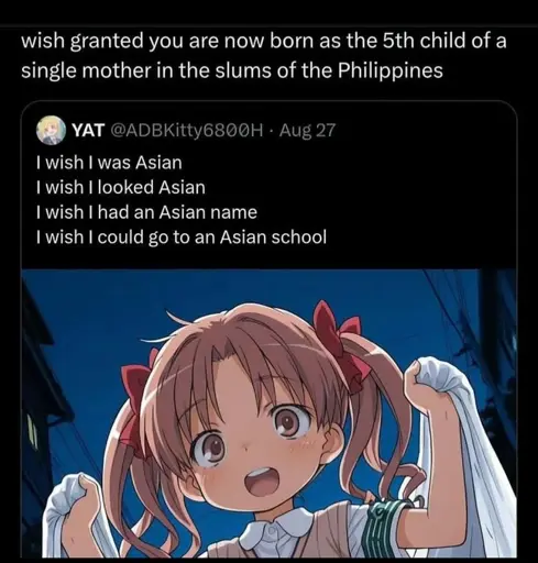 It really doesn’t sound like the original OP wants to be rich, though. As far as I can tell, their fantasy is to be a regular school kid (obviously Japan being the baseline, on account of including that anime pic and no one in the west (consciously) watching Korean or Chinese anime). I suppose an upper middle class kid in Philippines, Indonesia etc. is probably similar enough to satisfy anon’s fantasy. But I think especially in Korea and China, you would actually still be expected to work your ass off in school even if you’re rich.