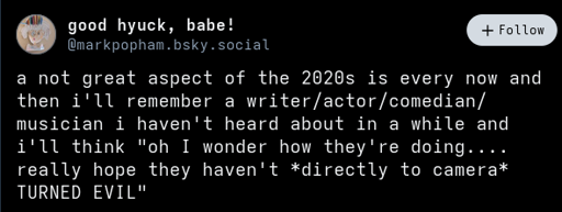 I dunno, I think the culture wars have done a special thing where people who were part of the same subculture years ago, or musicians i liked or whatever, but would never really have thought about their politics much, now you can find yourselves on opposite sides of the great dividing line.
