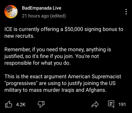 If you join ICE you are the enemy hell getting into Breaking and Entering or drug trafficking would be much more moral. There is no excuse to use your poverty as an excuse to violently oppress or kill others for money.
