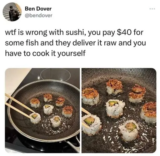 SSUPII@sopuli.xyz to Lemmy Shitpost@lemmy.world · 1 day agosushi deliverysopuli.xyzimagemessage-square94fedilinkarrow-up1802arrow-down114
