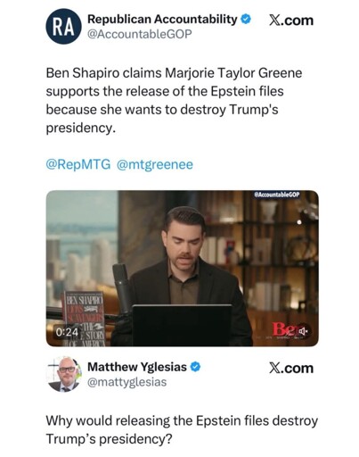 So Ben Shapiro knows that Trump is a crook, a pedophile, … But he’s more concerned with keeping those scandals covered up than with seeking justice. Keeping their guy in power is more important than any morality, which demonstrates how amoral the entire usa right wing has become.